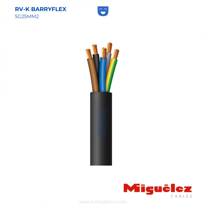 El cable Barryflex RV-K 5G25MM2 de Miguelez es un cable de baja tensión diseñado para aplicaciones industriales y comerciales de alta demanda. Cuenta con 5 conductores de 25 mm² que ofrecen gran capacidad de carga, asegurando una transmisión de energía eficiente y segura. Su alta flexibilidad facilita la instalación en espacios complejos, y su revestimiento resistente permite una larga vida útil incluso en condiciones exigentes, como en instalaciones exteriores y en contacto con agentes químicos o mecánicos.