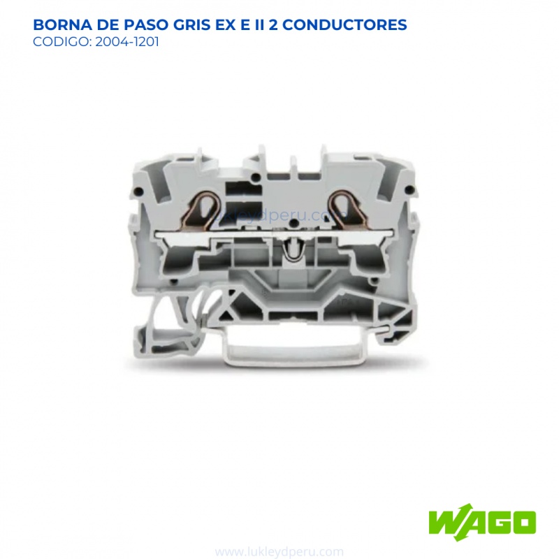 Borna de paso WAGO 2004-1201. Sirve para conectar de forma segura y eficiente dos conductores en instalaciones eléctricas industriales y comerciales. Permite la conexión de dos conductores, asegurando una unión eléctrica confiable.
